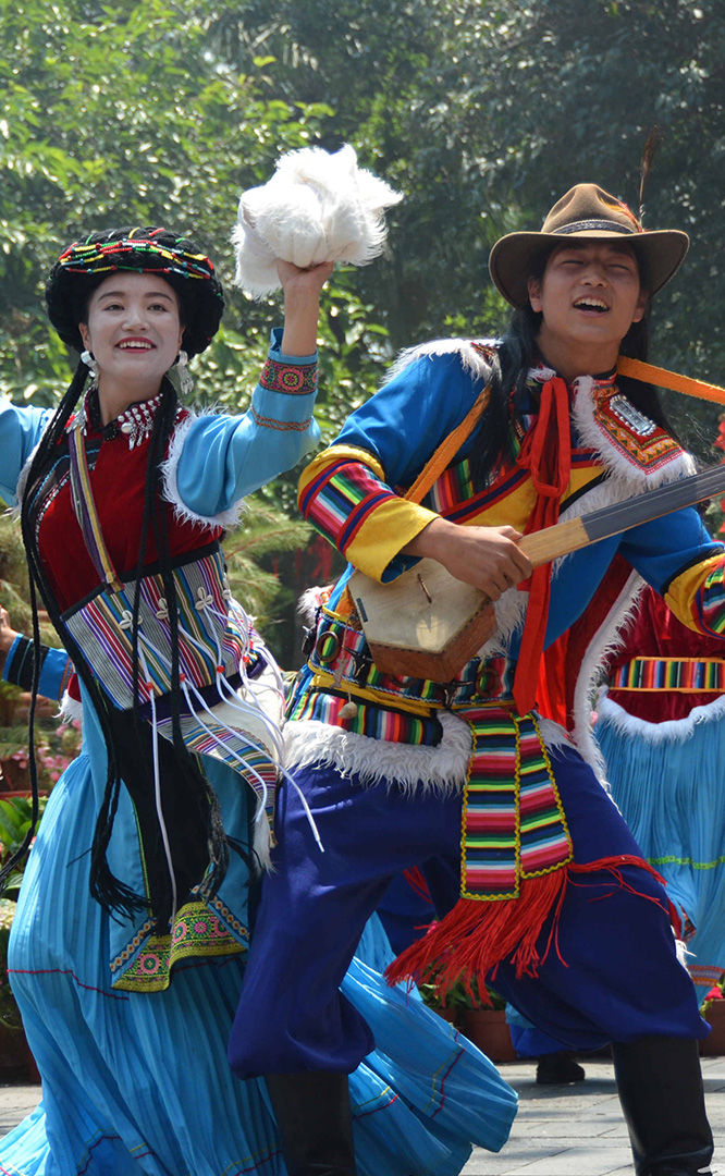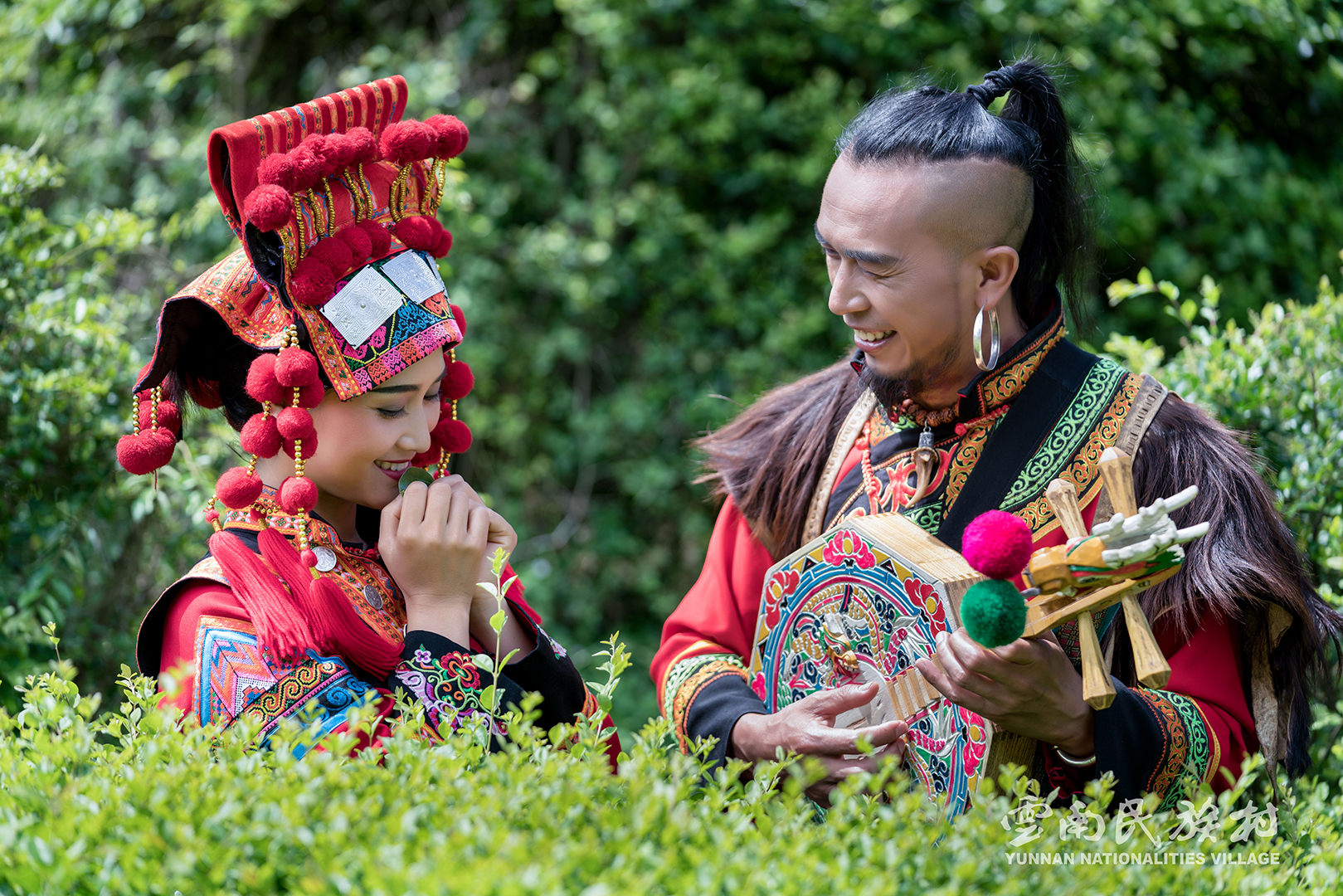 彝族在云南境內(nèi)約471萬(wàn)人,是省內(nèi)人口最多、分布最廣的少數(shù)民族,主要聚居在金沙江、元江流域和哀牢山、無(wú)量山腹地。彝族是一個(gè)能歌善舞的民族,民間打歌、跳樂(lè)之風(fēng)盛行,大三弦、跌腳舞久負(fù)盛名?;鸢压?jié)是彝族最具特色的民族節(jié)日。彝族村占地50余畝,三虎浮雕墻與虎頭內(nèi)祖師形象表現(xiàn)了彝族虎鷹文化。太陽(yáng)歷廣場(chǎng)圖騰柱上有太陽(yáng)、虎、火和八卦圖形象,周圍環(huán)繞著10個(gè)朝向不同的月球造型,外圓周有12生肖石雕。依山而建的“...